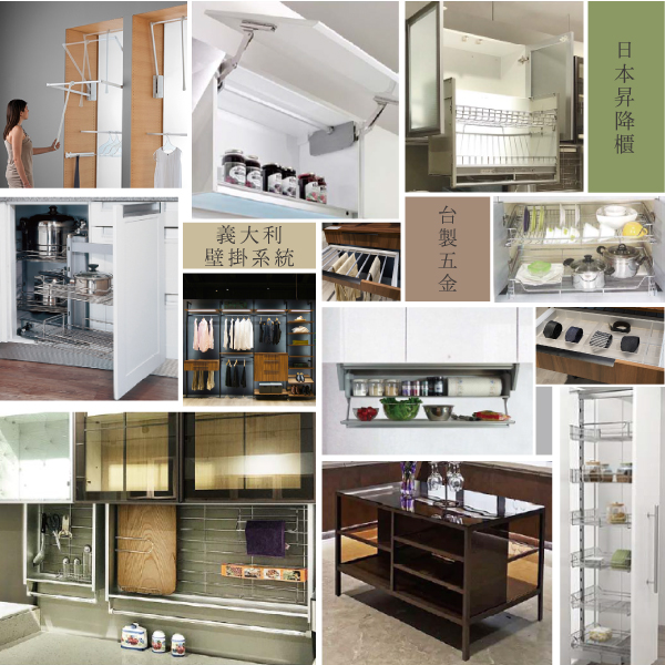 不鏽鋼拉籃、上掀門、拉門、折門、廚櫃燈、吊衣桿、穿衣鏡、鐵件收納架,昇降五金…